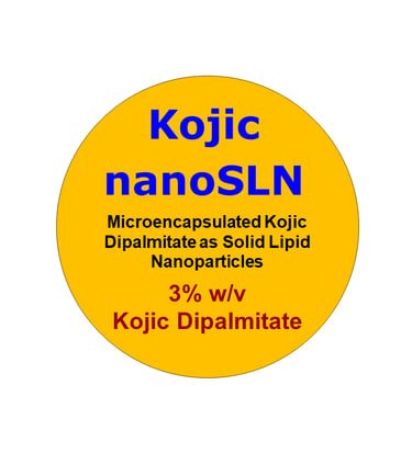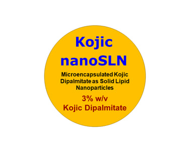 Kojic nanoSLN is Kojic Dipalmitate microencapsulated in solid lipid nanoparticles (SLNs) of size above 100 nm as a delivery carrier. The carrier protects Kojic Dipalmitate from degradation, enhancing its stability in the formulation. It also improves Kojic Dipalmitate activity and penetration through the skin. Usually, less concentration is needed from the microencapsulated active ingredient compared to the pure un-encapsulated one. The particles are stabilized in pH balanced suspension.