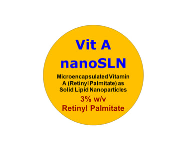 Vit A nanoSLN is vitamin A microencapsulated in solid lipid nanoparticles (SLNs) of size above 100 nm as a delivery carrier. The carrier protects vitamin A from degradation, enhancing its stability in the formulation. It also improves vit A activity and penetration through the skin. Usually, less concentration is needed from the microencapsulated active ingredient compared to the pure un-encapsulated one. The particles are stabilized in pH balanced suspension.